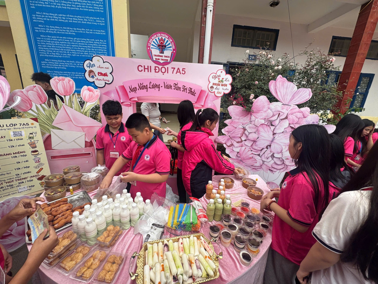 Bên cạnh các hoạt động mang tính nghi lễ, chương trình ngoại khóa còn trở nên sôi động với khu vực gian hàng khởi nghiệp do chính các lớp tổ chức. Tại đây, học sinh được thỏa sức sáng tạo, thể hiện khả năng kinh doanh, kỹ năng làm việc nhóm và tư duy thực tiễn. Các gian hàng đa dạng với nhiều sản phẩm hấp dẫn, từ đồ ăn vặt đến đồ handmade, đã tạo nên không khí náo nhiệt và đầy màu sắc. | |
