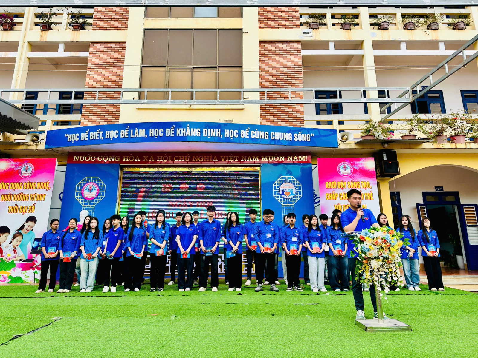 Sau các tiết mục văn nghệ cô Lương Thị Loan – Bí thư Đoàn trường đã trang trọng ôn lại truyền thống vẻ vang của Đoàn TNCS Hồ Chí Minh qua các thời kỳ. Trong không khí trang nghiêm, thầy và trò nhà trường cùng nhau nhìn lại chặng đường phát triển của tổ chức Đoàn, đồng thời khơi dậy niềm tự hào và ý thức trách nhiệm của thế hệ trẻ trong công cuộc xây dựng và bảo vệ Tổ quốc. Các em học sinh đã lắng nghe với sự trân trọng và niềm mong ước một ngày nào đó mình cũng sẽ được đứng trong hàng ngũ của Đoàn TNCS Hồ Chí Minh. Điểm nhấn quan trọng của buổi lễ là nghi thức kết nạp đoàn viên mới. Những học sinh ưu tú, có thành tích học tập và rèn luyện tốt đã vinh dự được đứng vào hàng ngũ của Đoàn. Khoảnh khắc đeo huy hiệu Đoàn trên ngực áo không chỉ là niềm tự hào cá nhân mà còn đánh dấu bước trưởng thành trong nhận thức và trách nhiệm của mỗi học sinh.