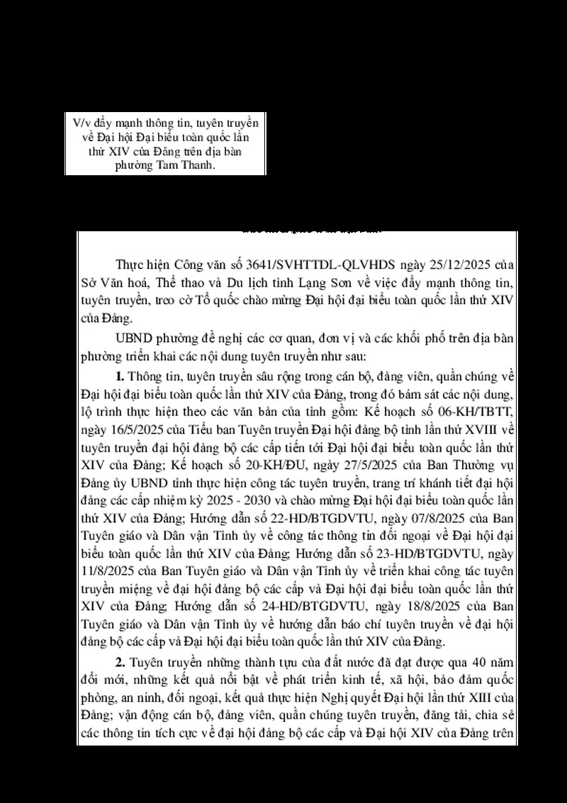 | Tiêu đề văn bản | Công văn đẩy mạnh thông tin, tuyên truyền về Đại hội Đại biểu toàn quốc lần thứ XIV của Đảng trên địa bàn phường Tam Thanh | ||