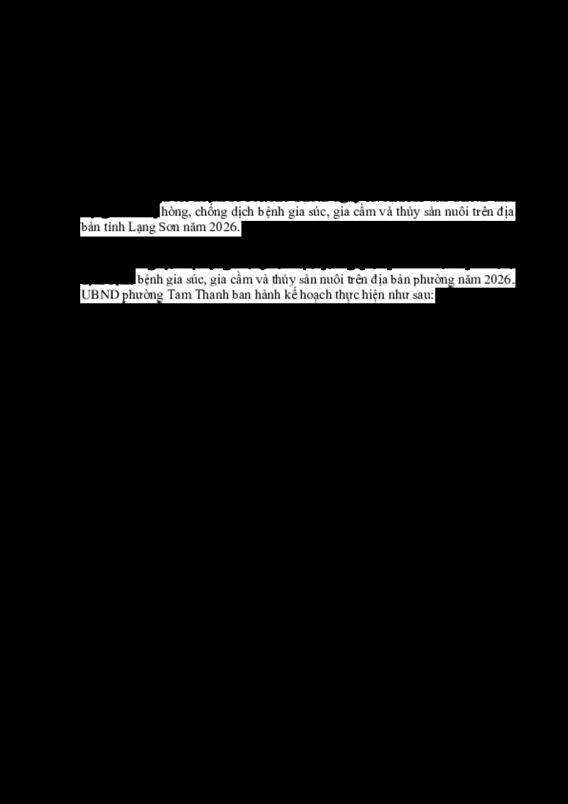| Tiêu đề văn bản | KẾ HOẠCH Phòng, chống dịch bệnh gia súc, gia cầm và thủy sản nuôi trên địa bàn phường Tam Thanh năm 2026 | ||