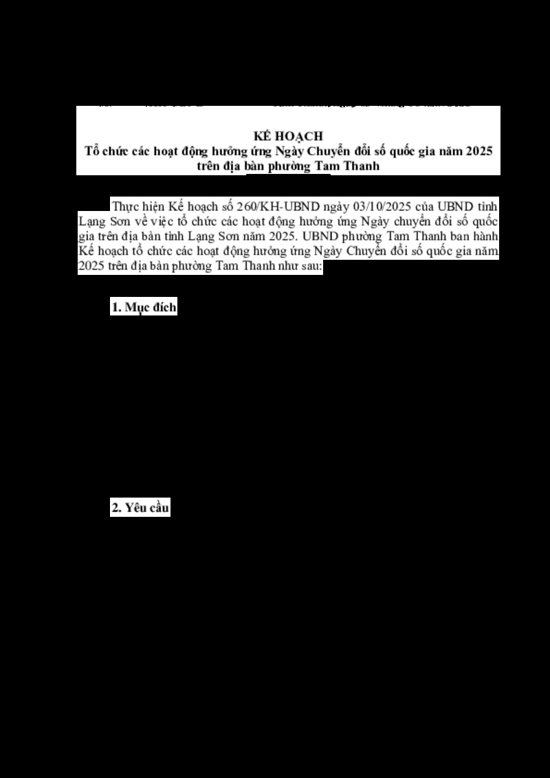 | Tiêu đề văn bản | KẾ HOẠCH Tổ chức các hoạt động hưởng ứng Ngày Chuyển đổi số quốc gia năm 2025 trên địa bàn phường Tam Thanh | ||
