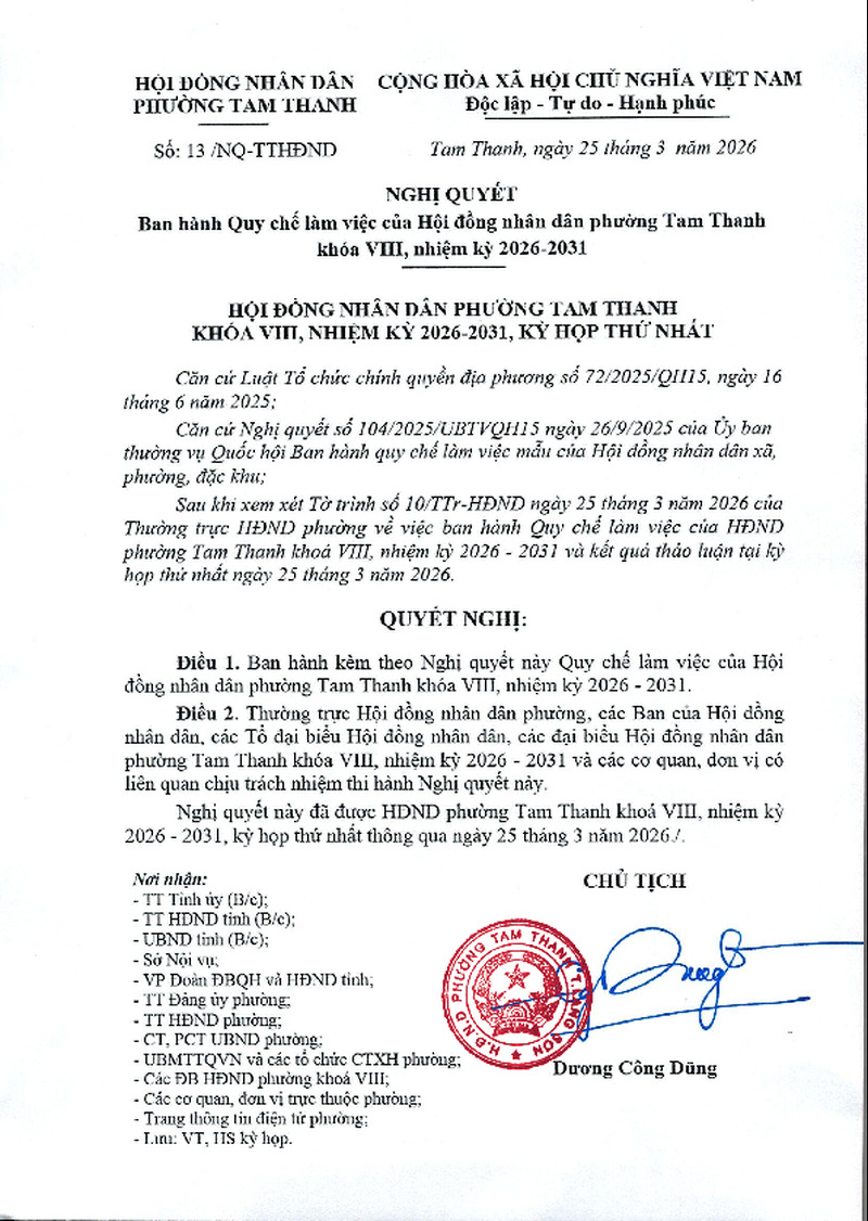 Tiêu đề văn bản NGHỊ QUYẾT Ban hành Quy chế làm việc của Hội đồng nhân dân phường Tam Thanh khóa VIII, nhiệm kỳ 2026-2031