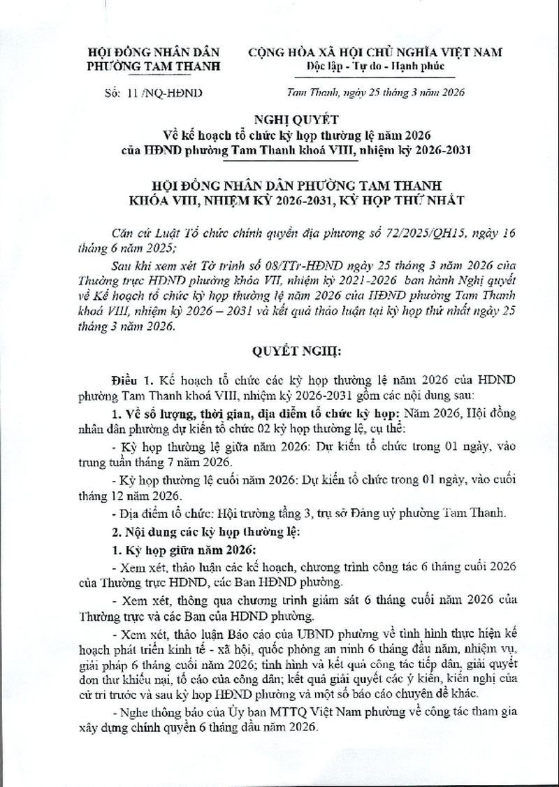 | Tiêu đề văn bản | NGHỊ QUYẾT Về kế hoạch tổ chức các kỳ họp thường lệ của Hội đồng nhân dân phường Tam Thanh khoá VIII, năm 2026 | ||