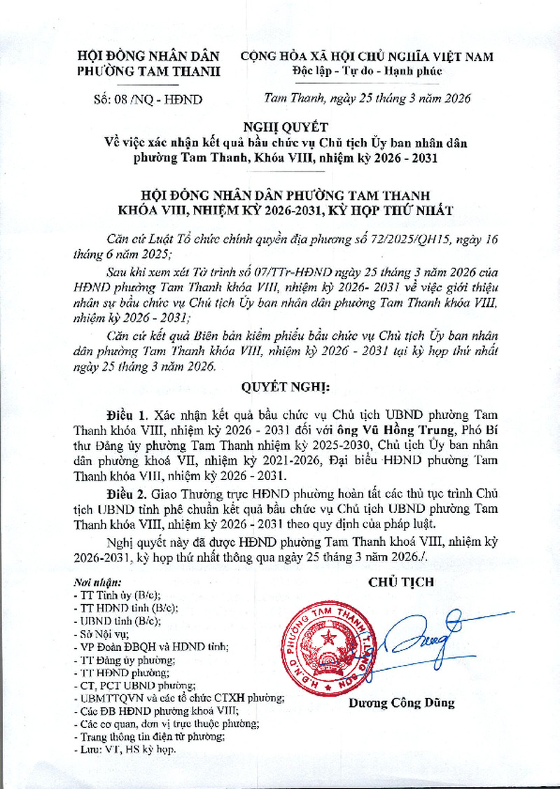 | Tiêu đề văn bản | NGHỊ QUYẾT Về việc xác nhận kết quả bầu chức vụ Chủ tịch Ủy ban nhân dân phường Tam Thanh, Khóa VIII, nhiệm kỳ 2026 - 2031 | ||