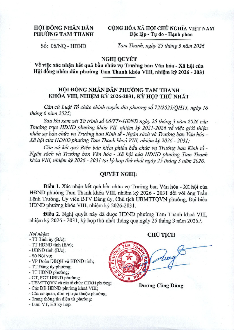 | Tiêu đề văn bản | NGHỊ QUYẾT Về việc xác nhận kết quả bầu chức vụ Trưởng ban Văn hóa - Xã hội của Hội đồng nhân dân phường Tam Thanh khóa VIII, nhiệm kỳ 2026 - 2031 | ||