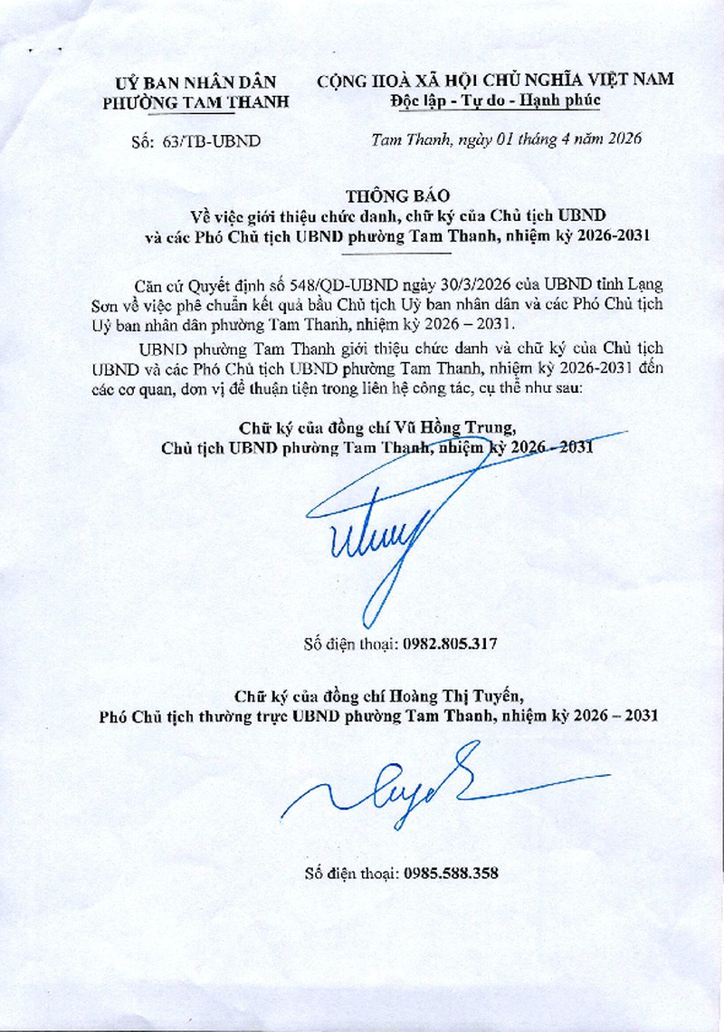 | Tiêu đề văn bản | Thông báo về việc giới thiệu chức danh, chữ ký của Chủ tịch UBND và các Phó Chủ tịch UBND phường Tam Thanh, nhiệm kỳ 2026-2031 | ||