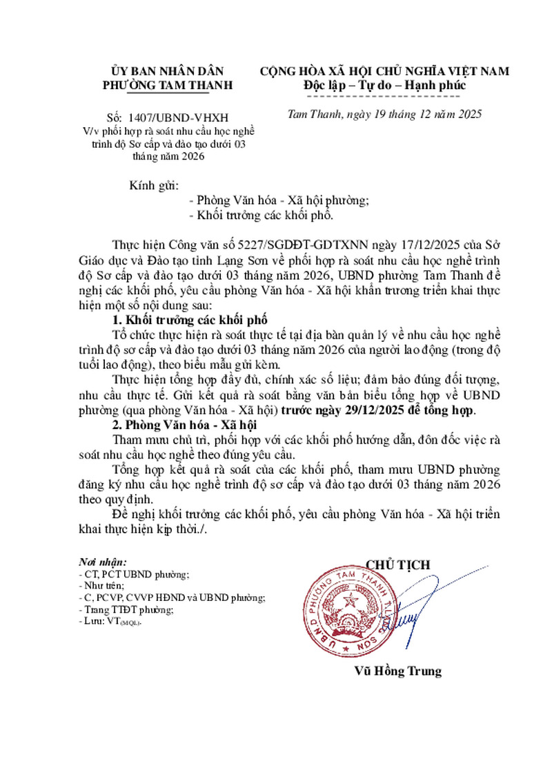 | Tiêu đề văn bản | V/v phối hợp rà soát nhu cầu học nghề trình độ Sơ cấp và đào tạo dưới 03 tháng năm 2026 | ||
